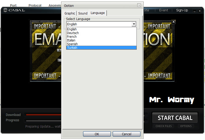 Launcher çalıştırdığınızda, “Options” tuşunu göreceksiniz. (START CABAL’ın altında). 3. seçenekte “Language” sekmesini göreceksiniz. “Turkish” seçip “OK” tuşuna bastıktan sonra Client Türkçe olacaktır.