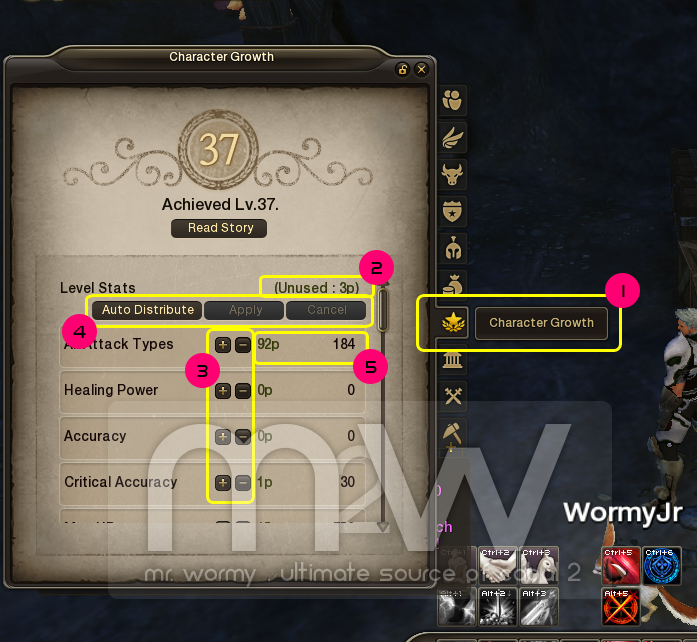 First thing first, every time you leveled up, you will get some stats for distributing. For accessing the “Character Growth” UI, press C then click on “Character Growth” tab.