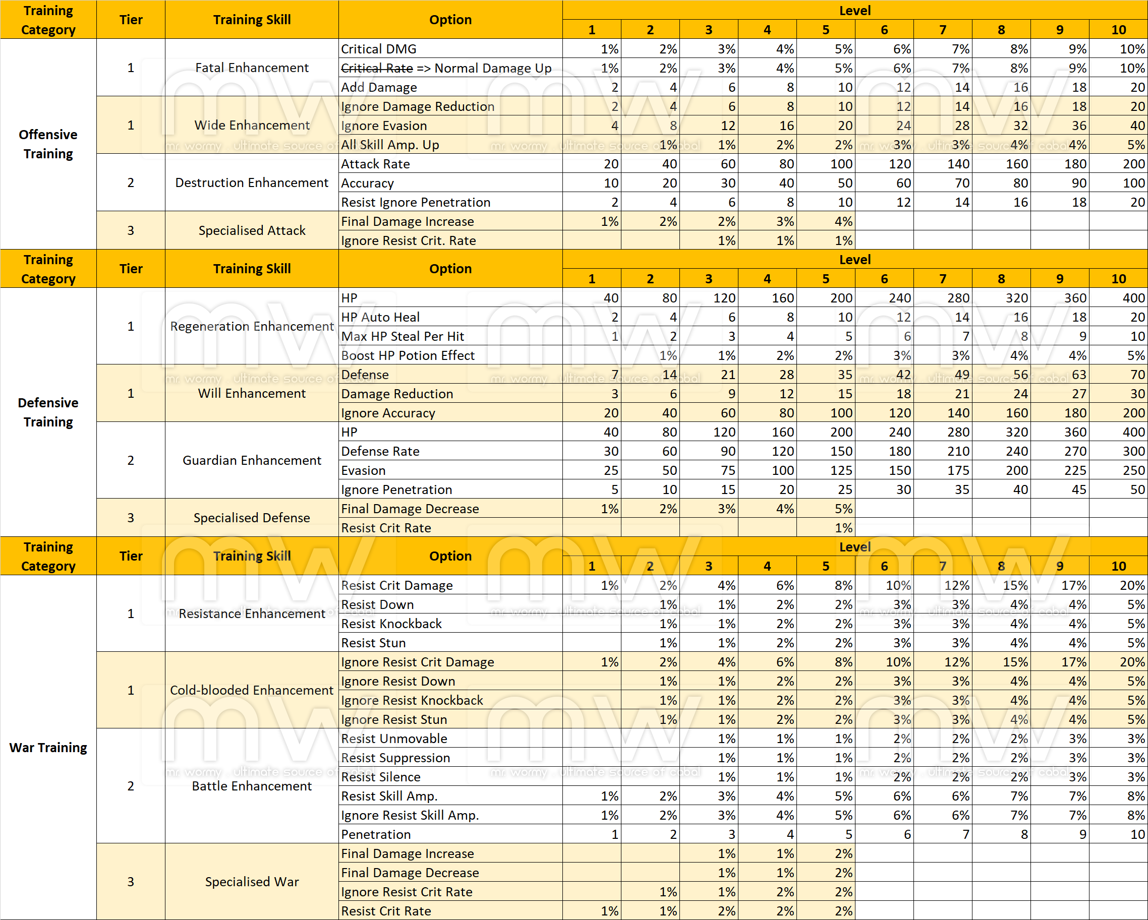 Last update: 06/06/2019 for Offensive Training > Fatal Enhancement > change Crit Rate to Normal Damage Up. Thanks to “DrCuCuka” Mercury / Cabal Europe.