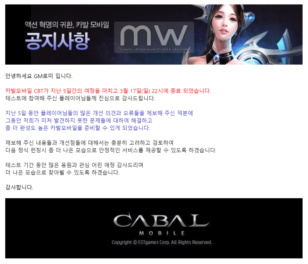 On the official site, they also posted an announcement for the closure and shared that, now they are working seriously on all feedback and suggestion, in order to get a smooth and better Cabal Mobile for the next public launch*