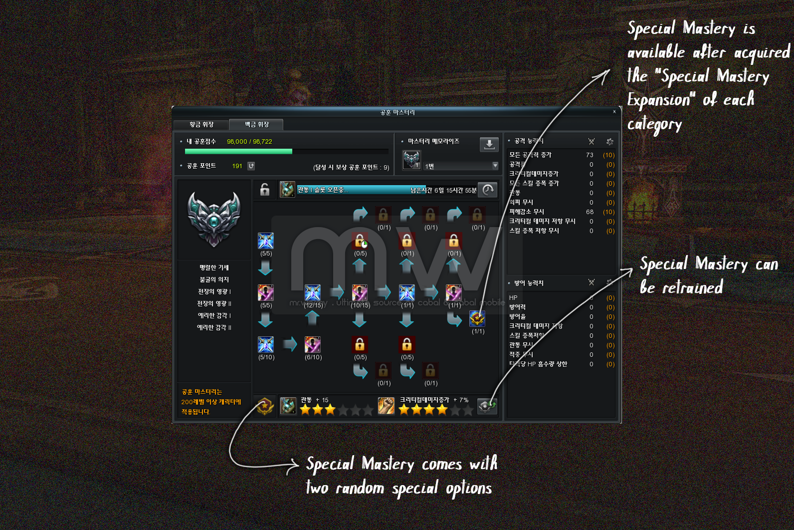 • By clicking on the Special Mastery button at the bottom of each category (after acquired the “Special Mastery Expansion” of that category)
