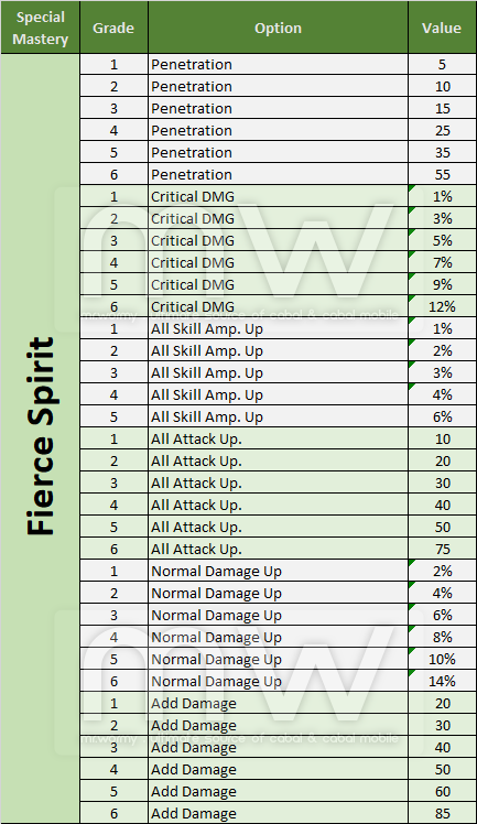 - Updated on Oct 26th 2020: Values of Fierce Spirit Special Mastery for All Skill Amp.