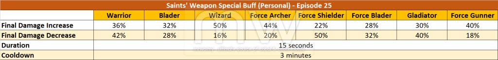 • The buff skill is applicable for only the character who has the “Saints Weapon”