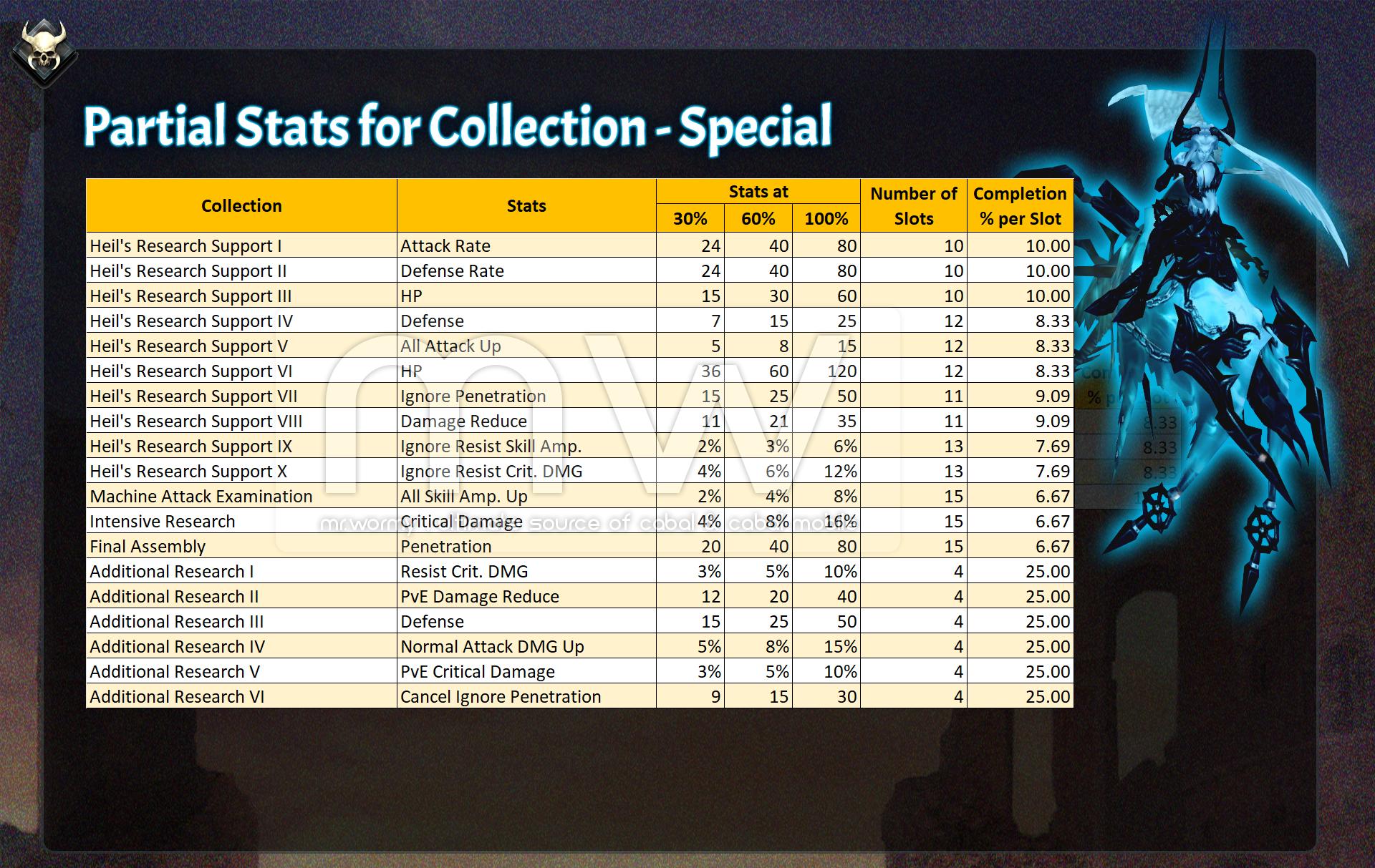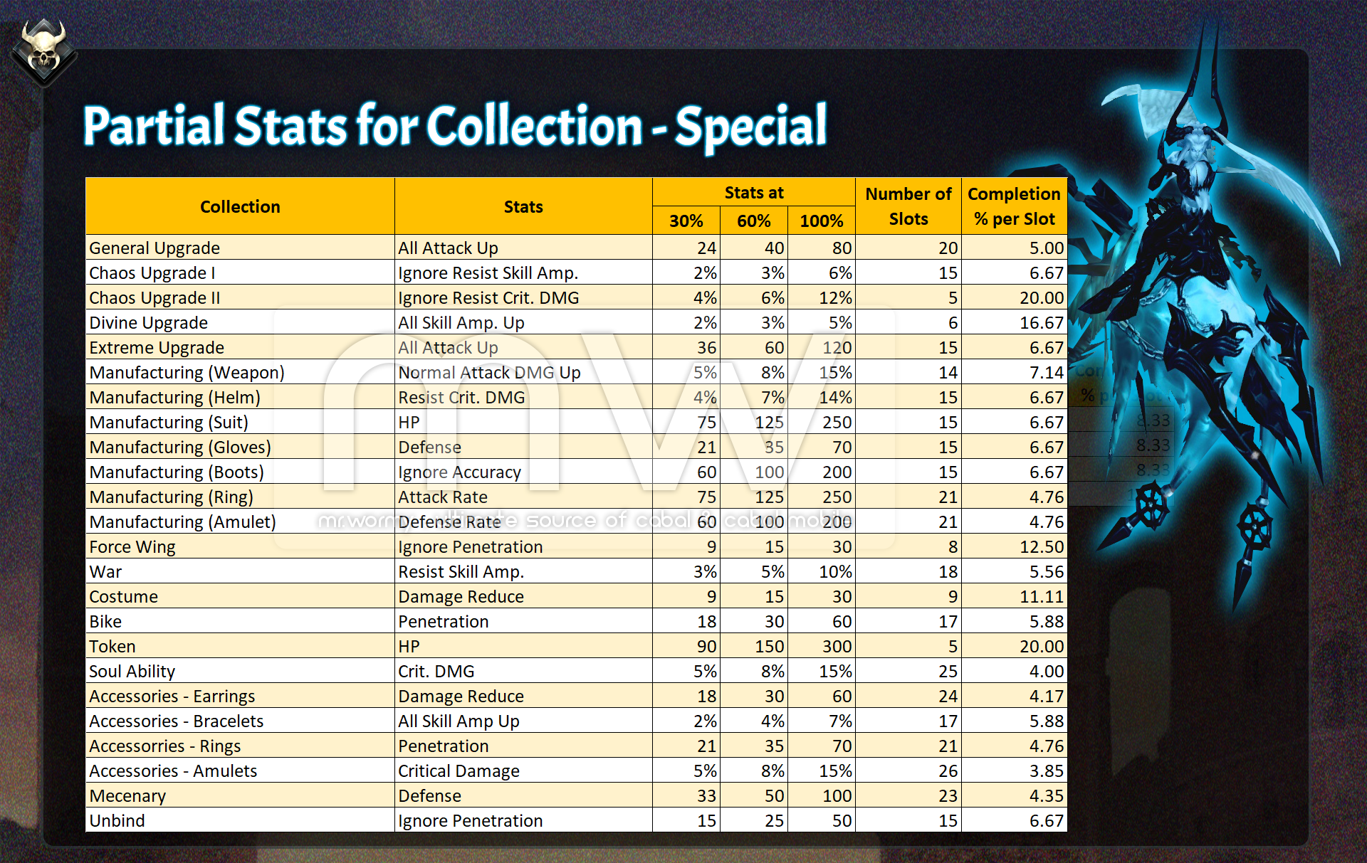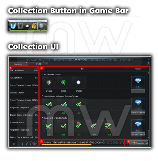 - Overall collection completion reward is automatically obtained after completing missions in collection and obtaining each reward – Collection completeness 100% ->completion effect automatically applies (Different complete effect shows with each collection)