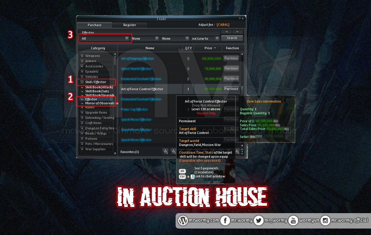 Effector is cash item, you can get it from the Cash Shop. Or from Auction House. In Auction House, Effector is categorised under “Skill / Effector” (1) > “Effector” (2). You can filter a specific Effector that you want using the filter of Auction House (3).