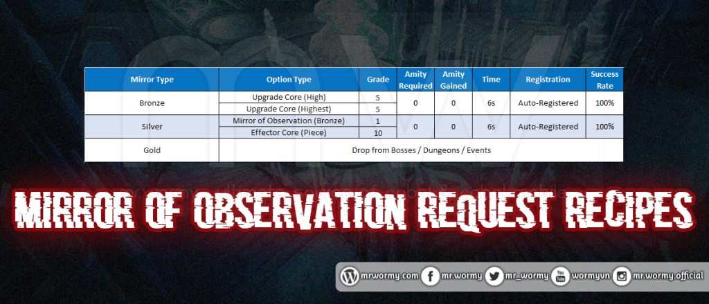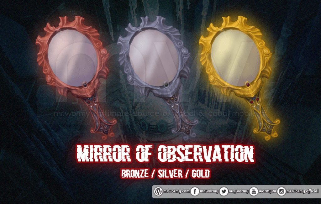 All types of Mirror of Observation can be obtained from various in-game Events. Beside, Bronze and Silver can be obtained via Requesting at NPC Chloe. And the Gold grade can be obtained as drop from certain Dungeons / Field Bosses.