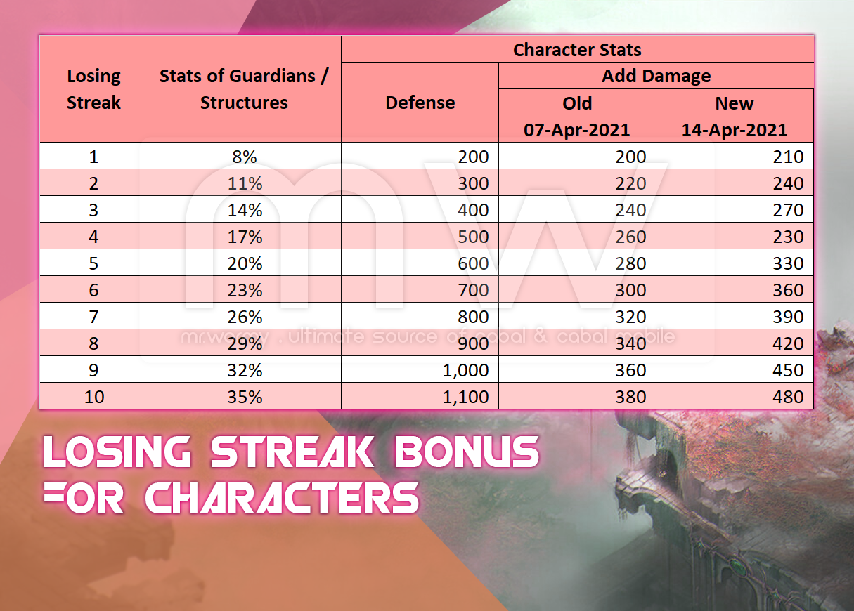- Increased stats based on the Revenge Force buff level (also knowing as the Losing Streak)