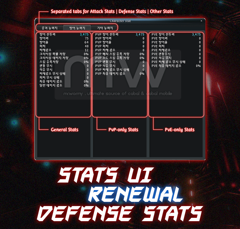 - Calculation of PvP Defense Ability is the sum of General Stats and PvP-only Stats.