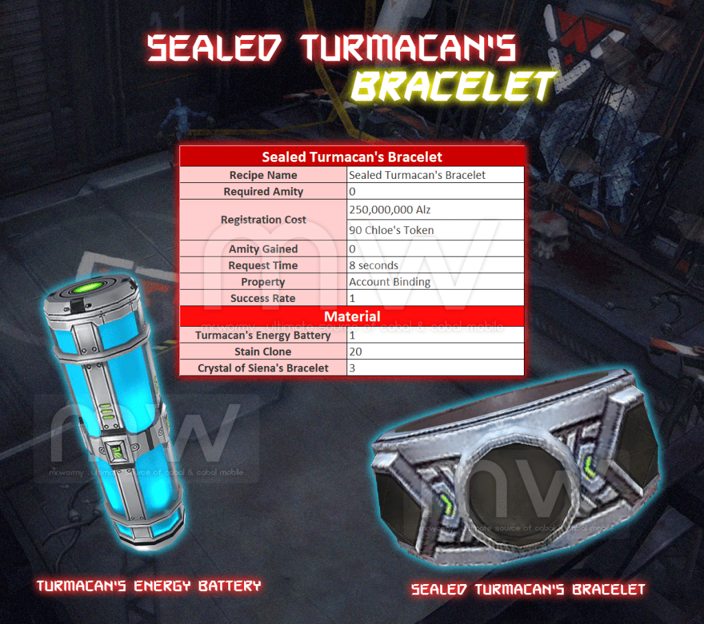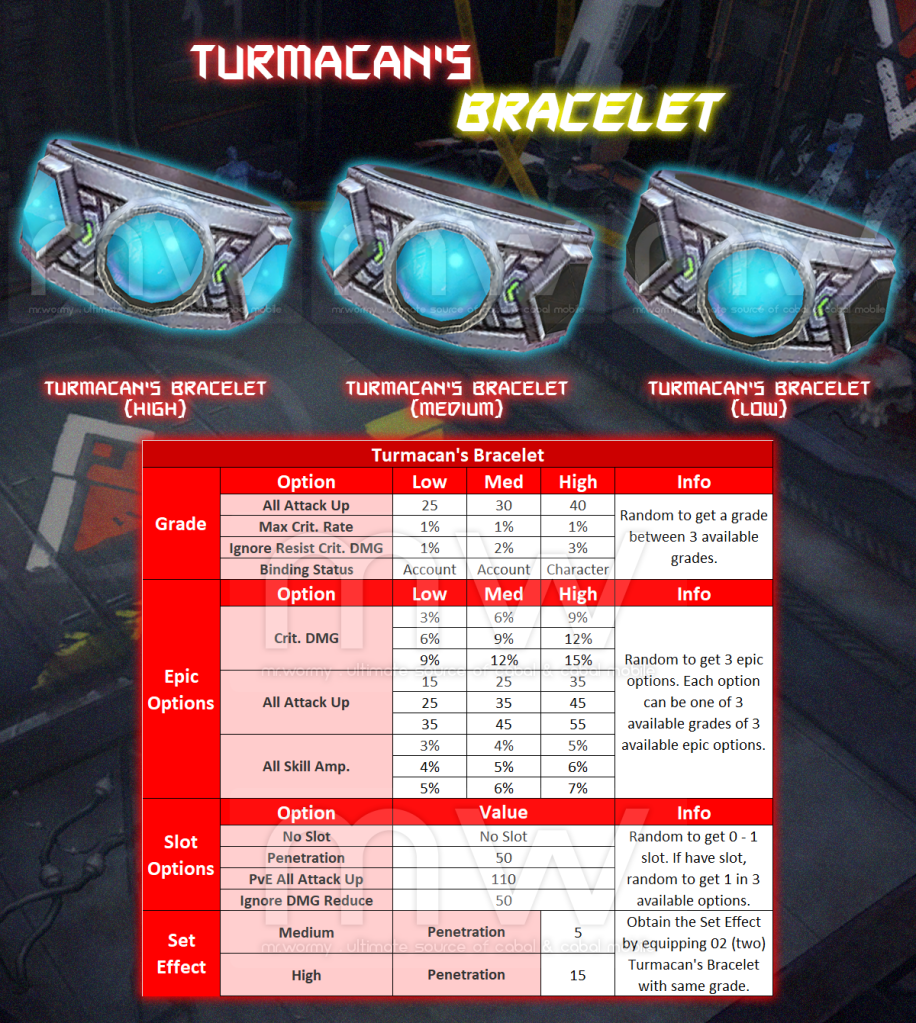 - Turmacan’s Bracelet can be obtained from the Sealed Turmacan’s Bracelet. On opening, a random Turmacan’s Bracelet will be generated with random of grade, slot, epic options.