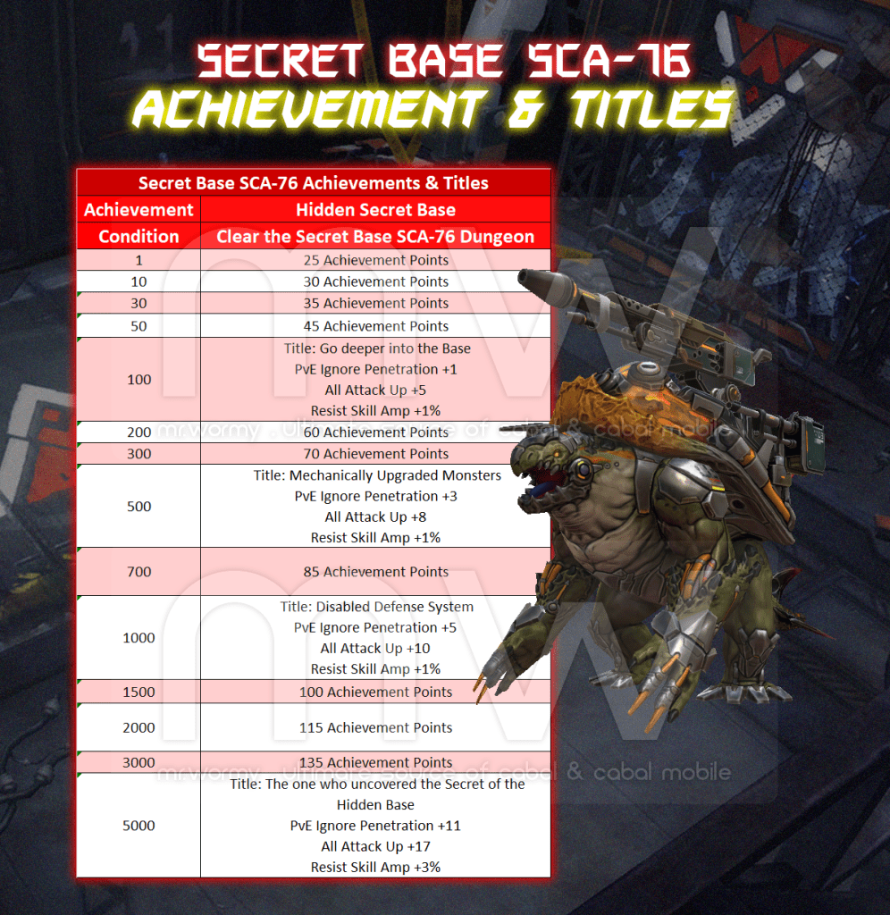 - Add Secret Base SCA-76 dungeon clear achievement and titles: