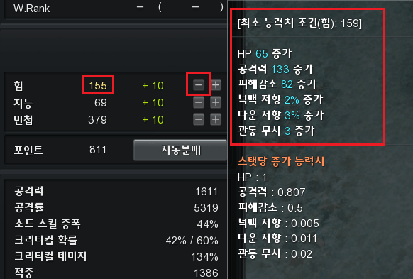 - By moving the mouse on the stats increase / decrease buttons ( + / – ), a tooltip will show the minimum value for that stat.