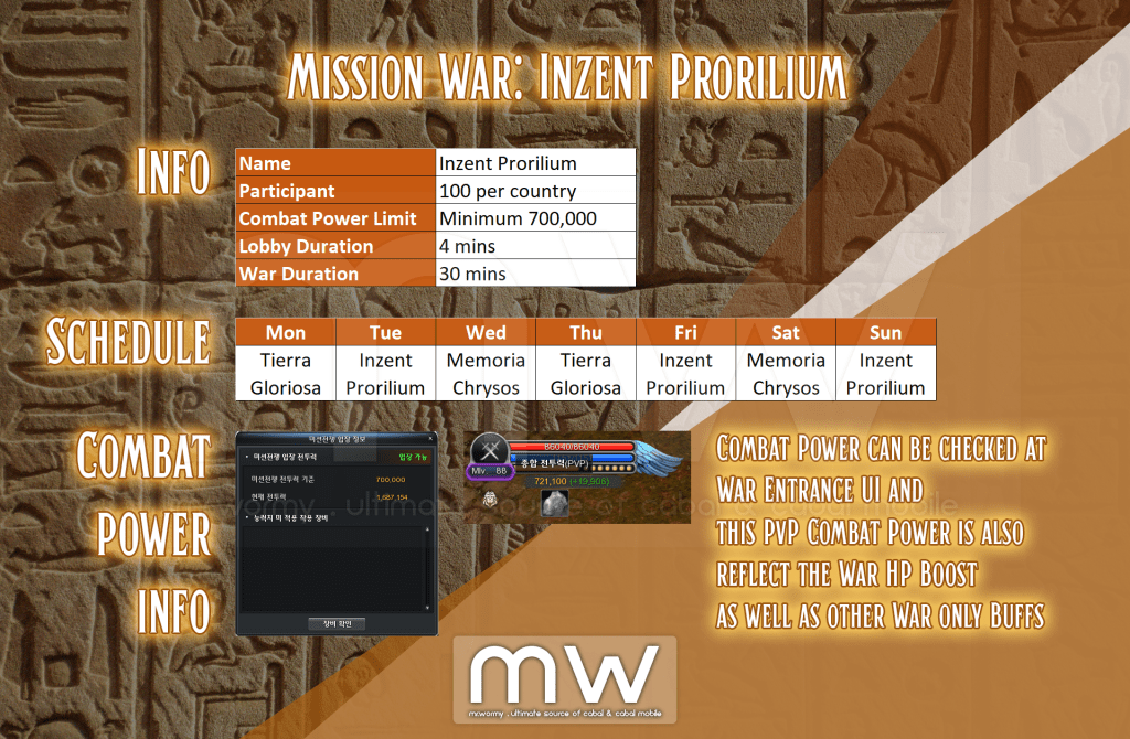- Only players with minimum Combat Power of 700,000 can enter the Mission War: Inzent Prorilium.