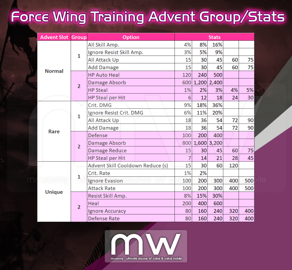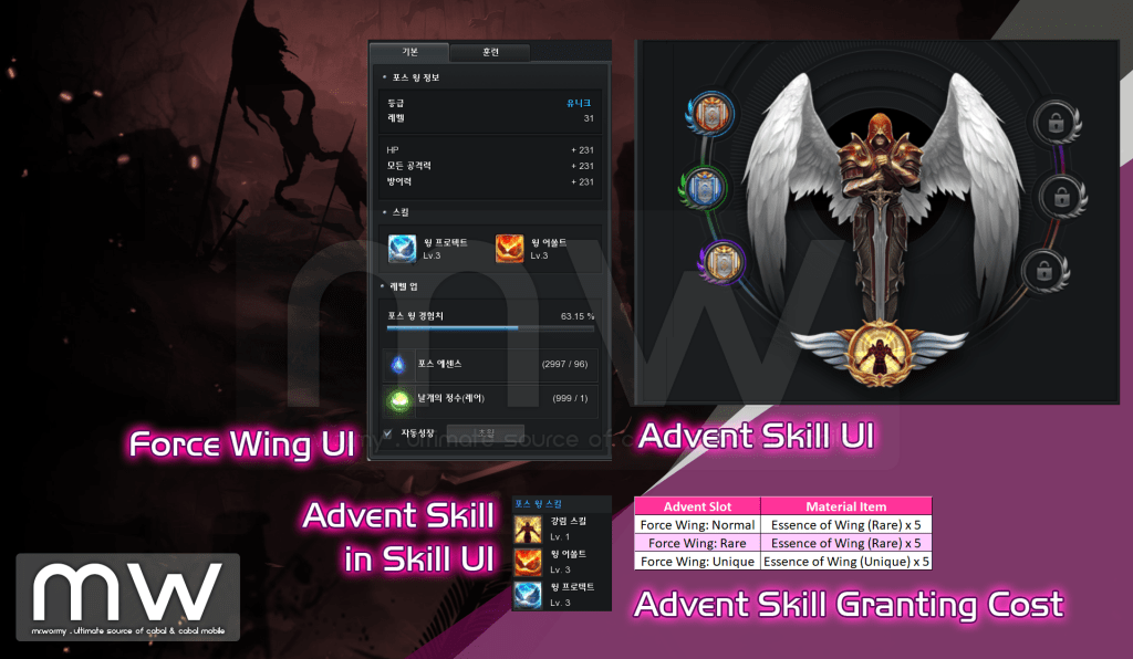 - For granting the stats, Essence of Wing according to the grade of the Advent Slot will be consumed.
