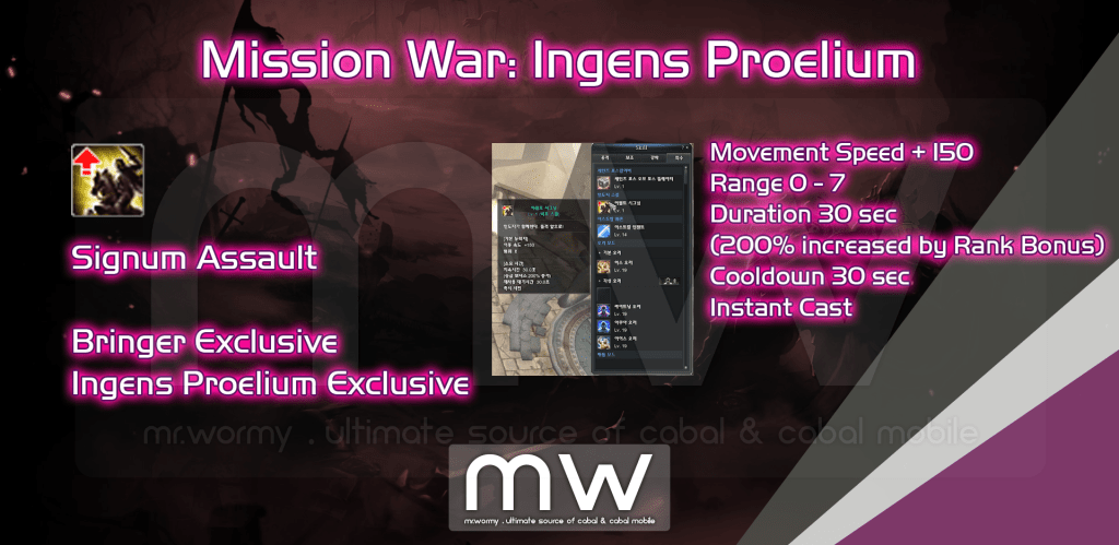 - The skill is available for all characters to see, but usable only by the Mission War Bringer and only usable in Mission War: Ingens Proelium