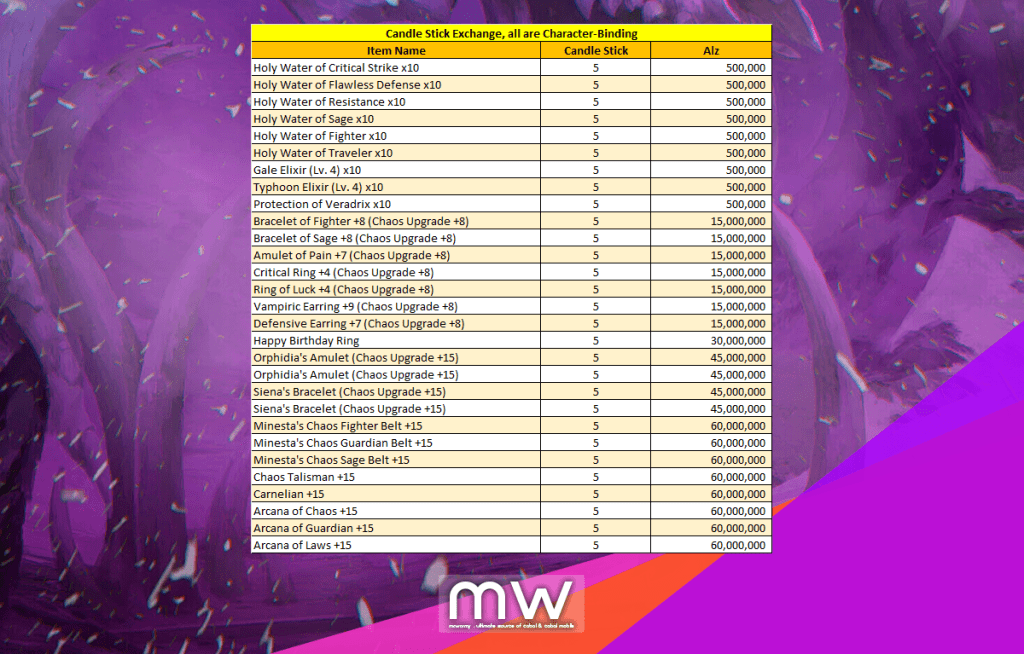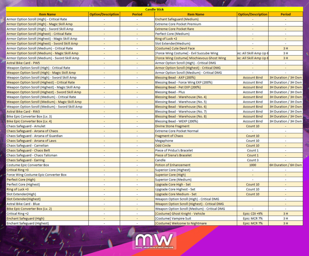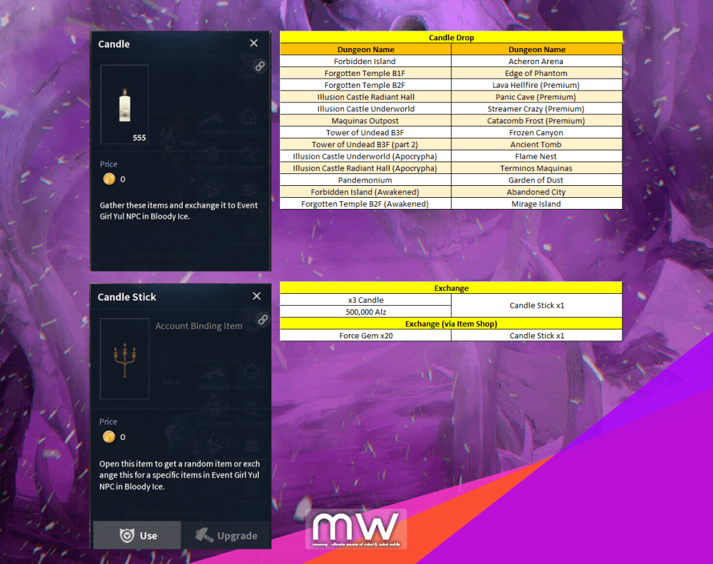 - Use your Candle Sticks to get a surprise item from the list below OR exchange Candle Sticks with NPC Yul to get the prize you want. / Mở Candle Stick để có cơ hội nhận được những vật phẩm ngẫu nhiên hoặc đổi Candle Stick cho NPC Yul để nhận được những vật phẩm hữu ích