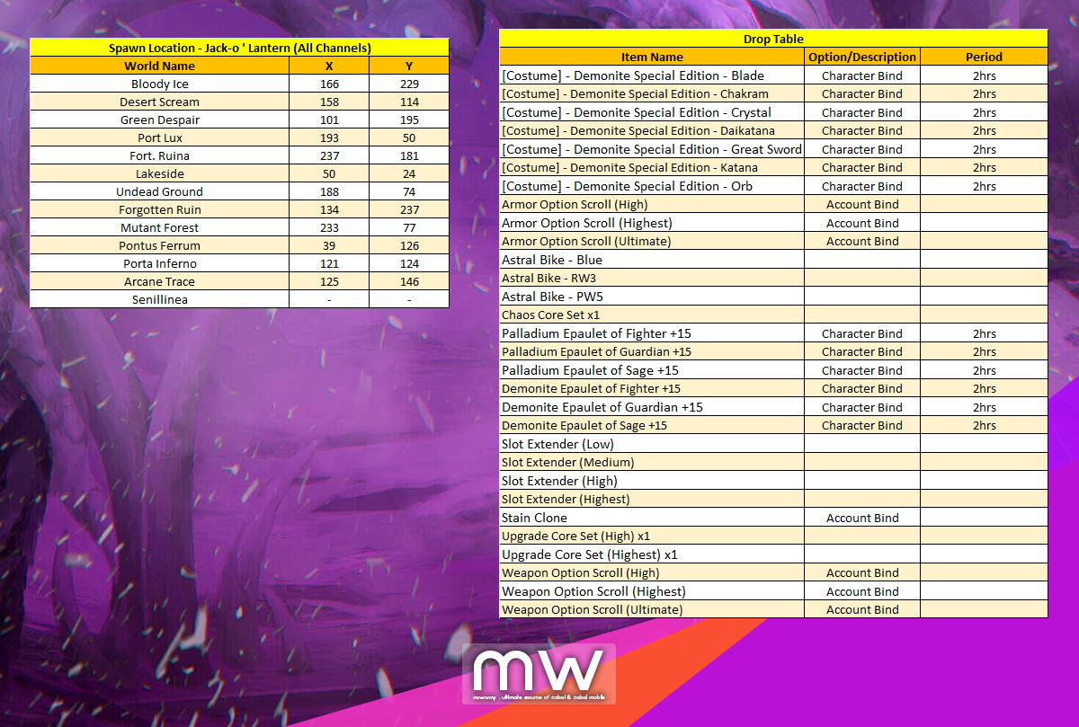- Đánh bại Jack-o ‘ Lantern kẻ đang xâm chiếm lục địa Nevareth từ ngày 03/11 đến 13/11/2022. Xuất hiện mỗi 3 giờ tại vị trí cụ thể. Jack-o’ Lantern sẽ rớt ra những vật phẩm đặc biệt!