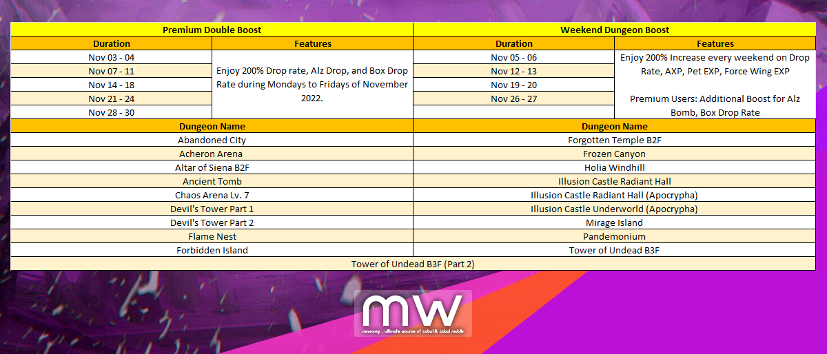 - Get the awesome boost in the selected dungeons either in weekdays or weekends!