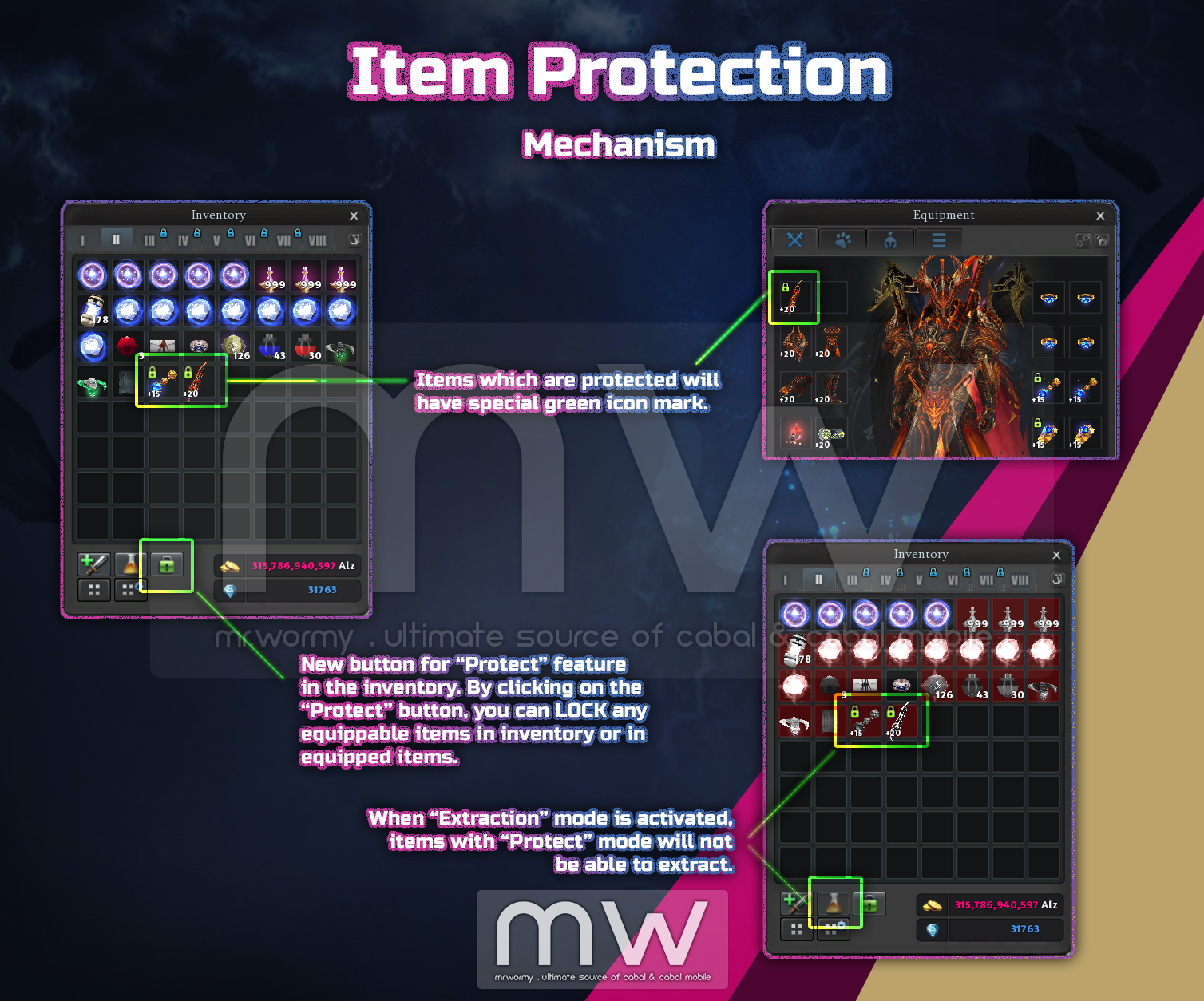 - Click on the target items in “Equipment UI” or “Inventory UI” to protect the items.