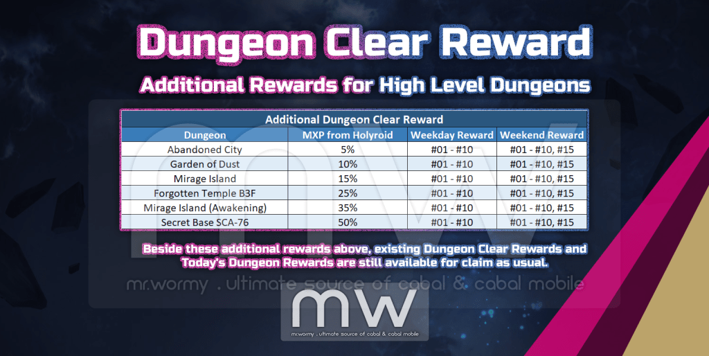 - This reward will be added to be run in parallel with existing Dungeon Clear Reward and Today’s Dungeon Reward.