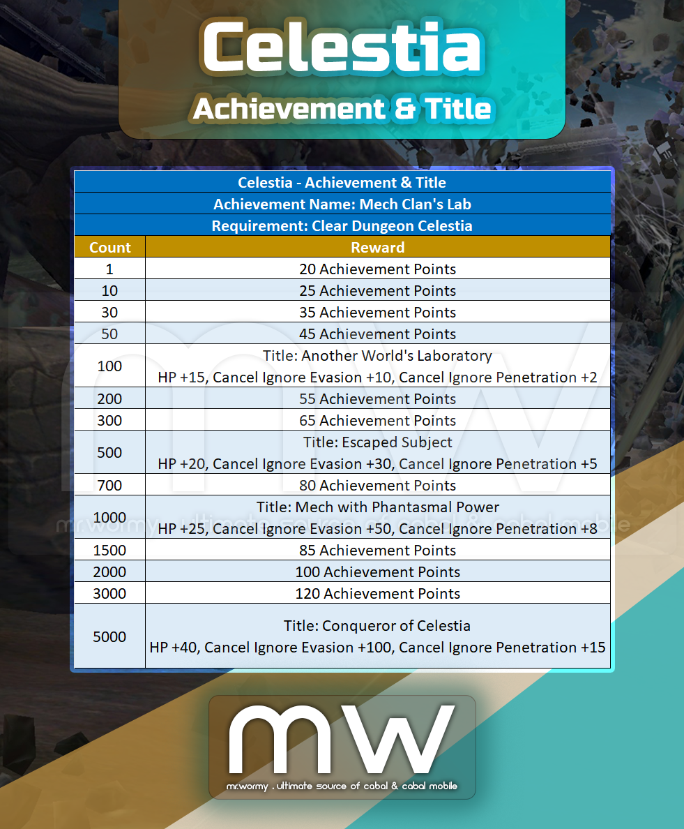 - Add achievements & titles for the dungeon “Celestia” (refer to the table below).
