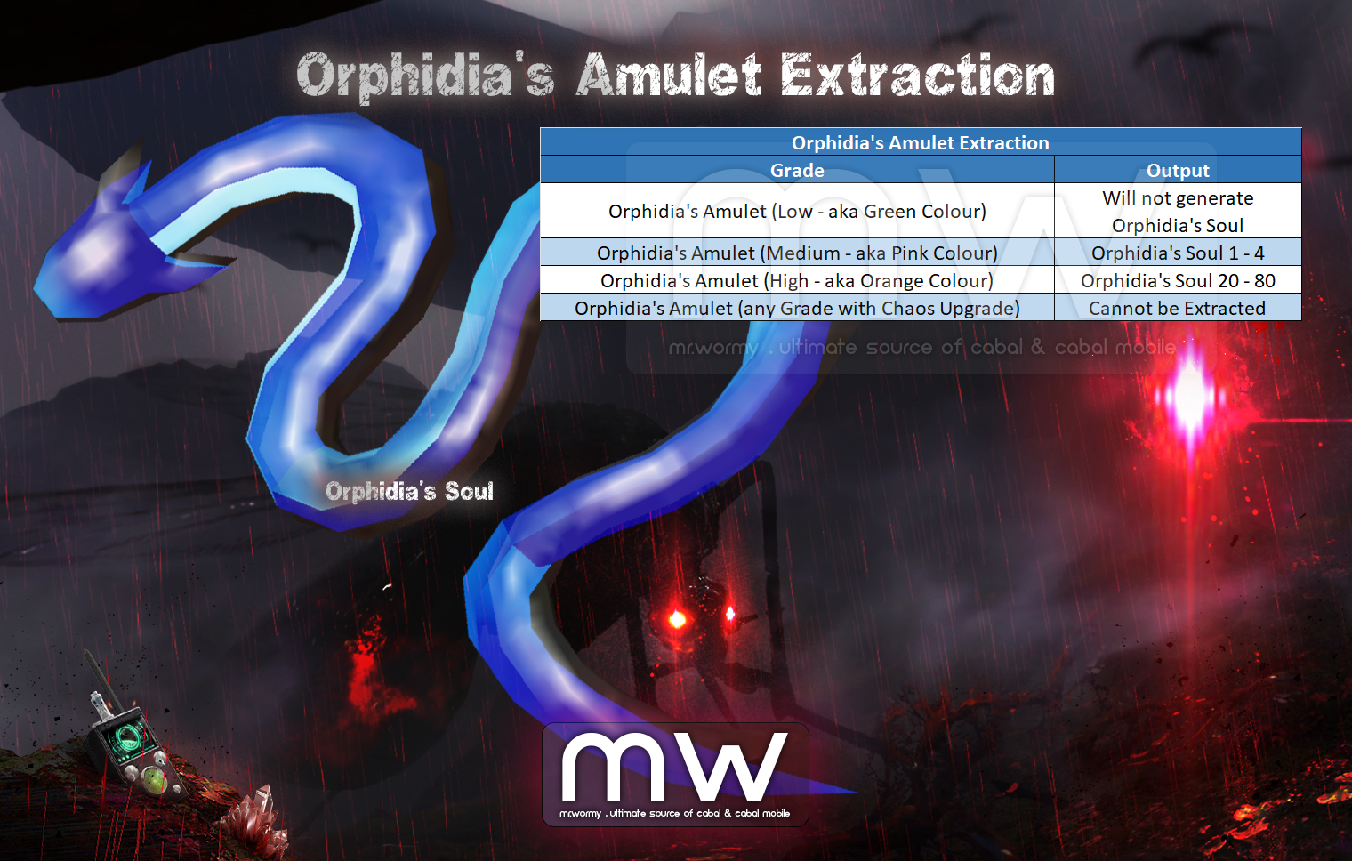 - Orphidia’s Amulet (Low) will not generate Orphidia’s Soul on extraction.