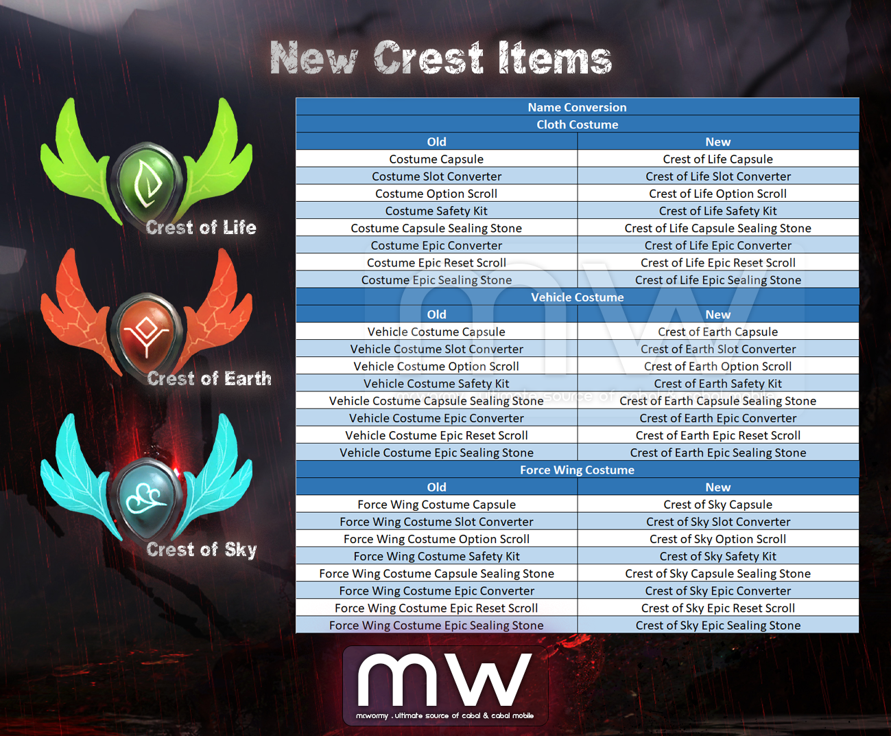 - New Item Type “Crest” to store the stats of Costumes