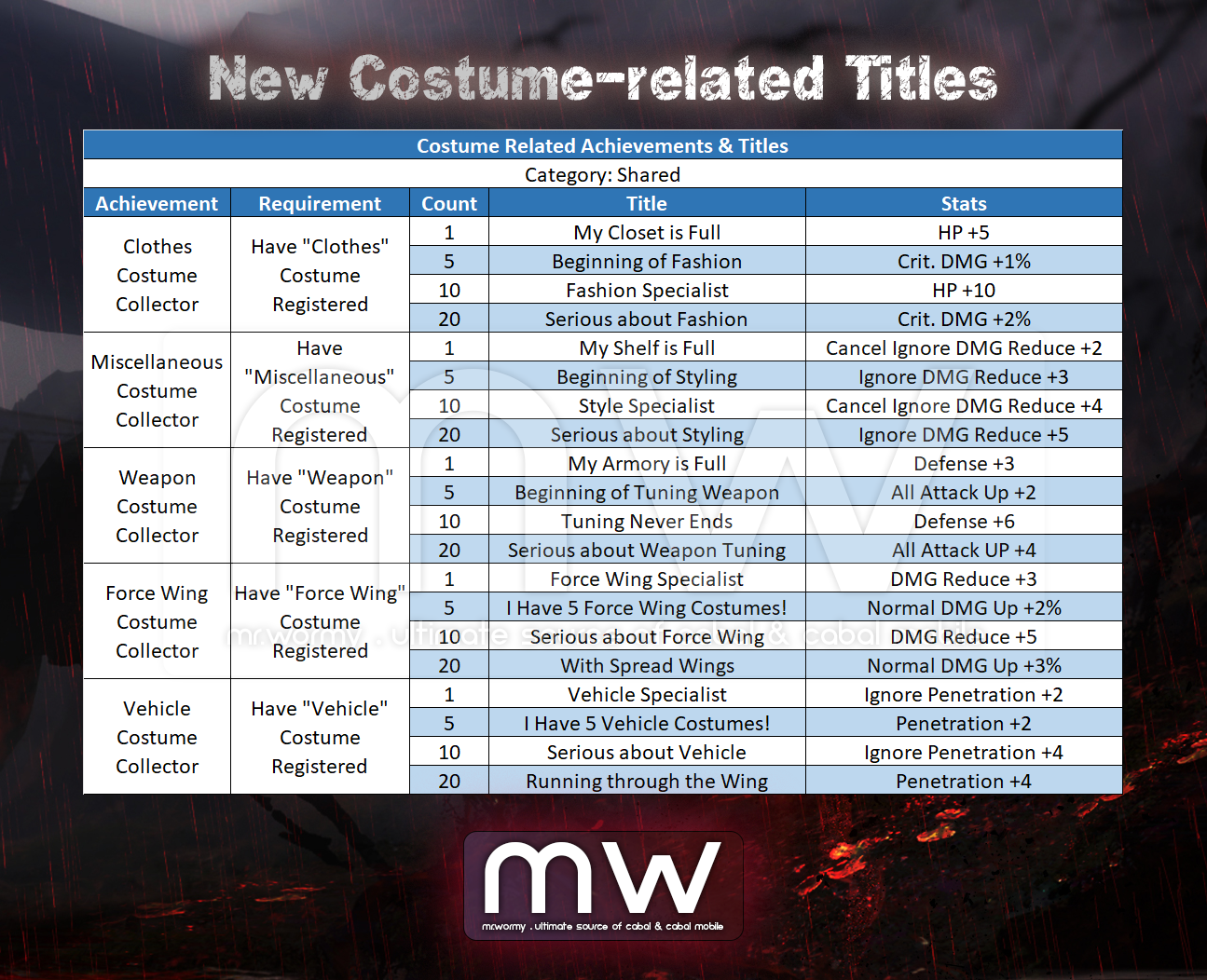 - All of equipped costumes before the update will be removed and send to character via in-game mail.