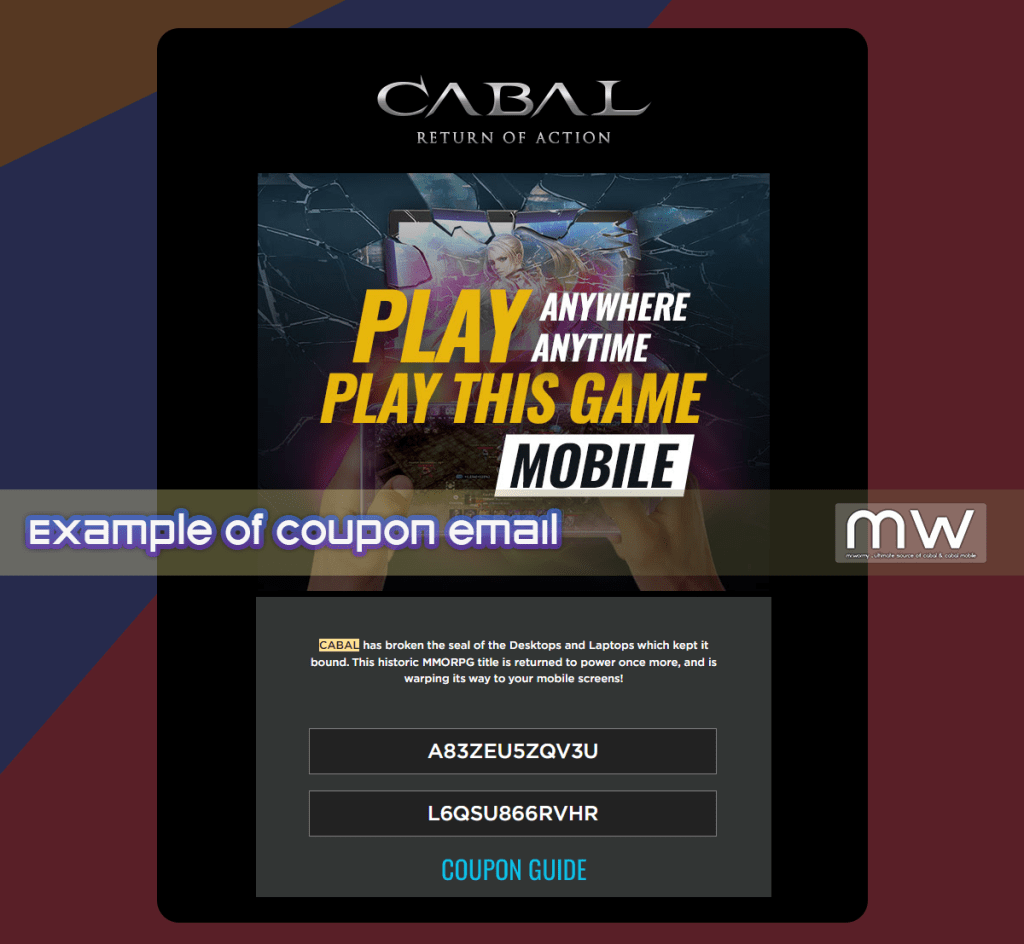Get your coupon code from wherever you can, for the case of the Pre-registration for Cabal Mobile: Return of Action, it will be sent to the email address that you used for pre-registration for the game. Remember to check also in your spam folder.