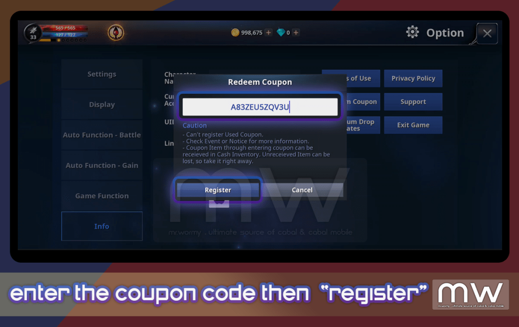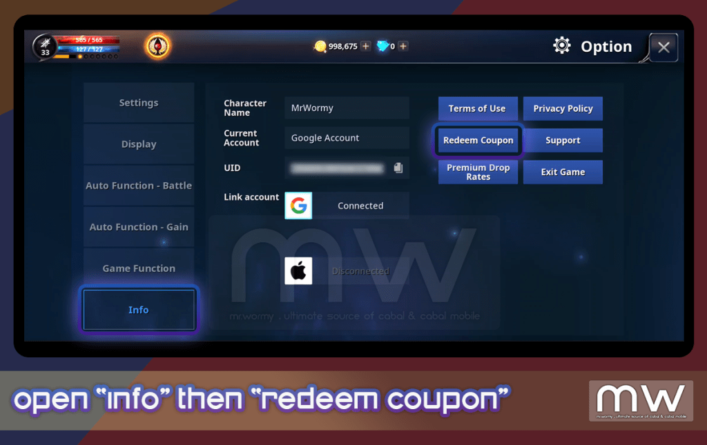At the “Option” UI, click on the “Info” tab then click on the “Redeem Coupon” button on the right side.