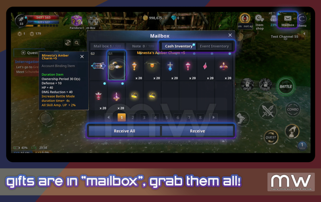 If you enter the valid code, then just open the “Mailbox” then either in “Cash Inventory” or “Event Inventory” for the gift items, you can receive individually or in bulk. For the case of pre-registration, gifts will be in Cash Inventory.