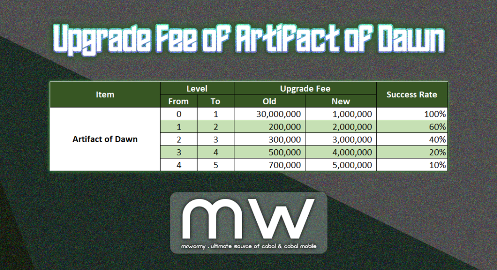 1. Change of Upgrade Fee for Artifact of Dawn: