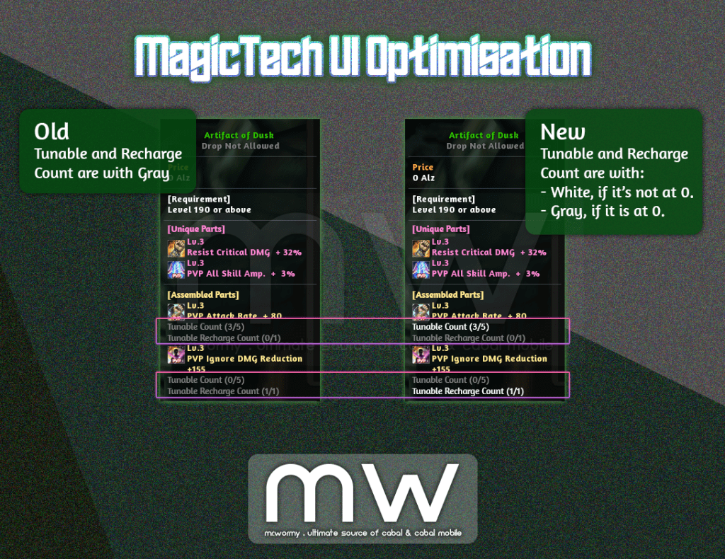 4. Change the text color of parts in tooltip reflecting the availability of tuning / recharging.