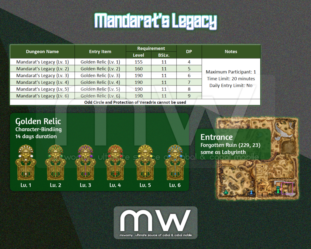 - Maximum 10 times per week you can receive the rewards from the Mandarat’s Legacy system (that means 10 Golden Relic, and that means you need 100 times earning the Exploration Point)