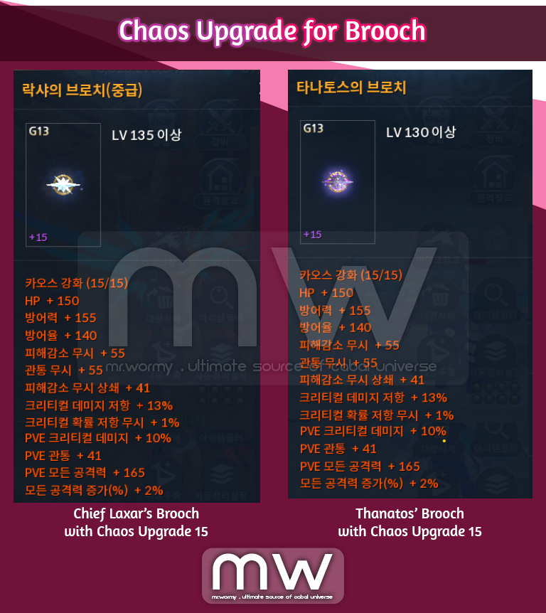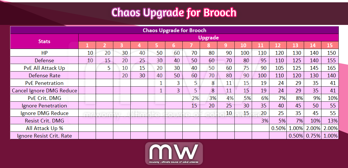 - Brooch can be upgraded up to +15 for Chaos stats.