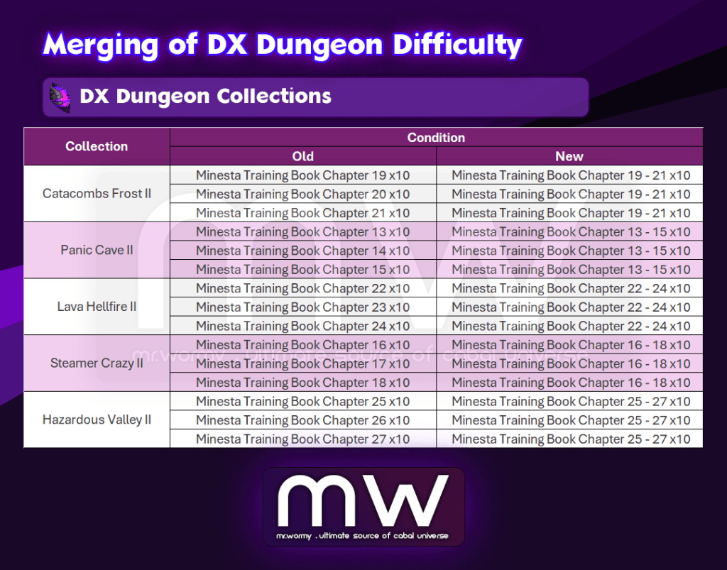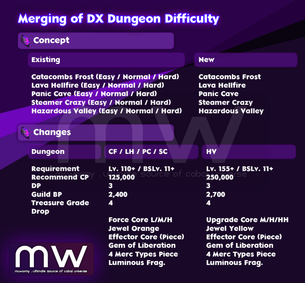 - Concept: Merging the Easy / Normal / Hard for 5 types of DX Dungeons: