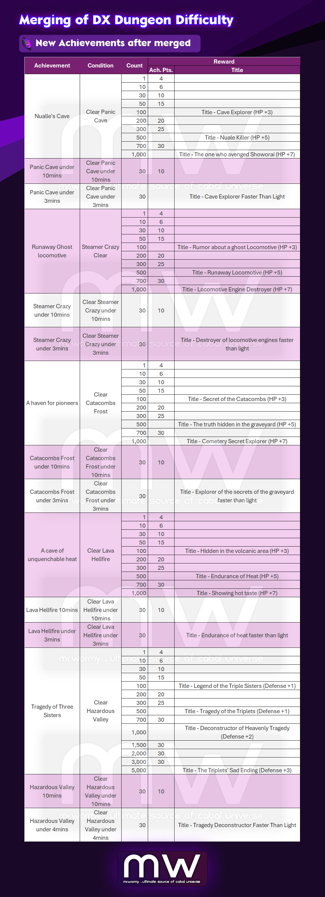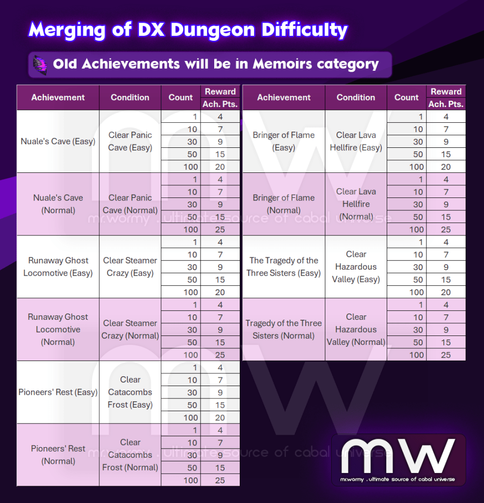 - Achievement for “Hard” will be changed into the universal achievement for the merged DX Dungeon, the run counts from Easy and Normal will be merged into the new achievement.