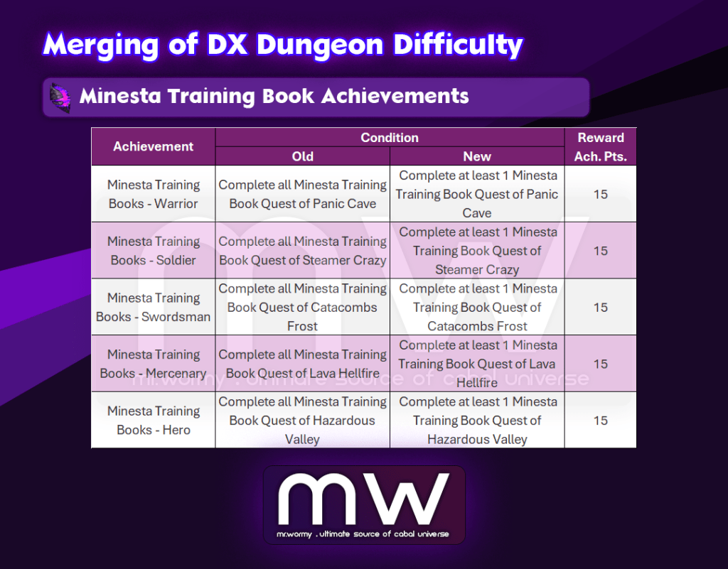 - Changes of Achievements related to Minesta Training Book of DX Dungeons