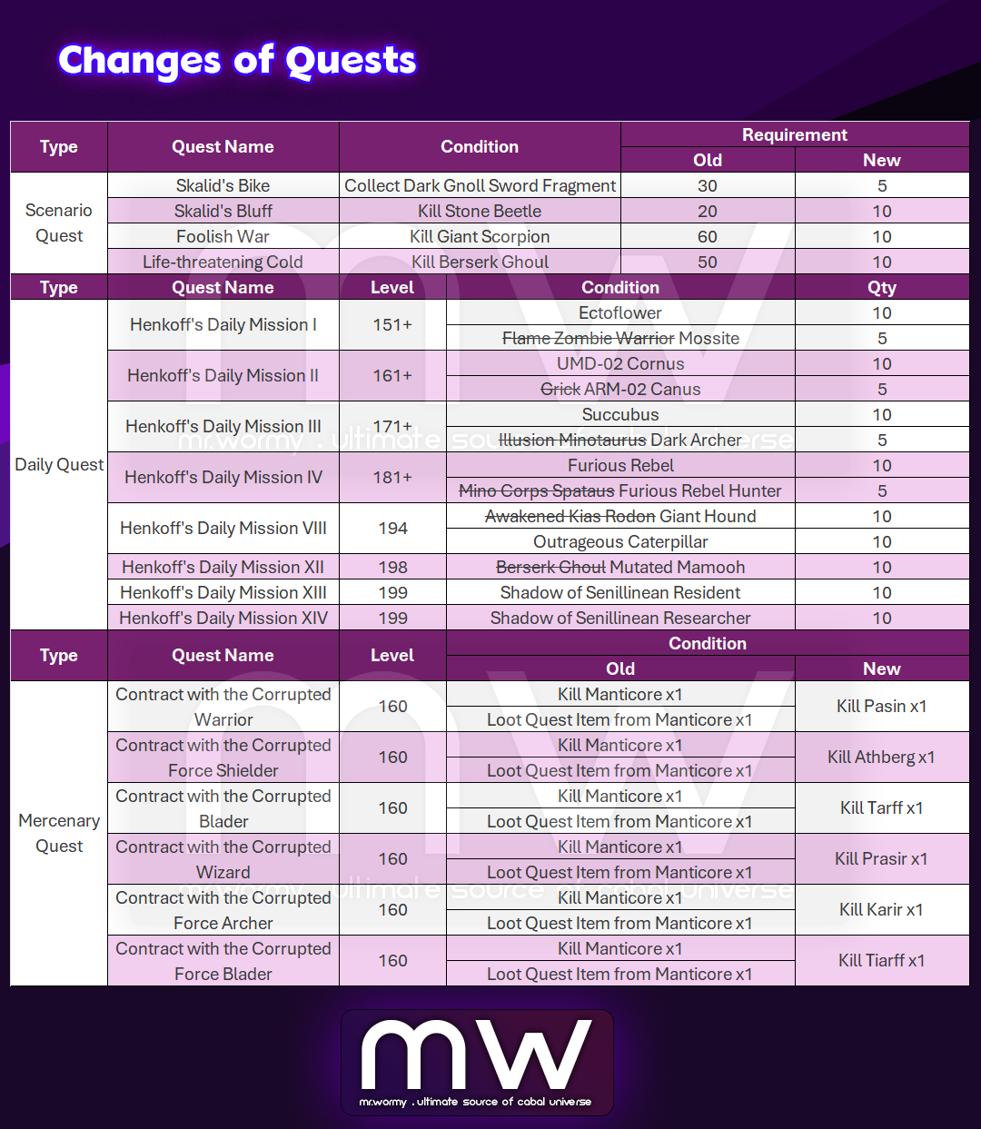 - Change of Daily Quests from NPC Henkoff (refer to the table below).