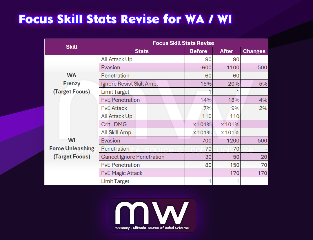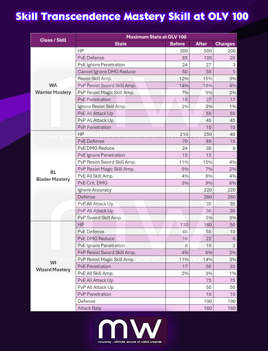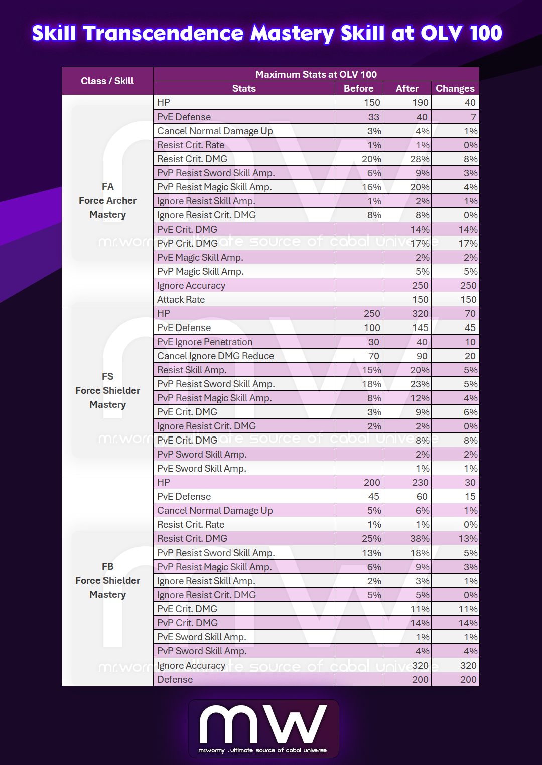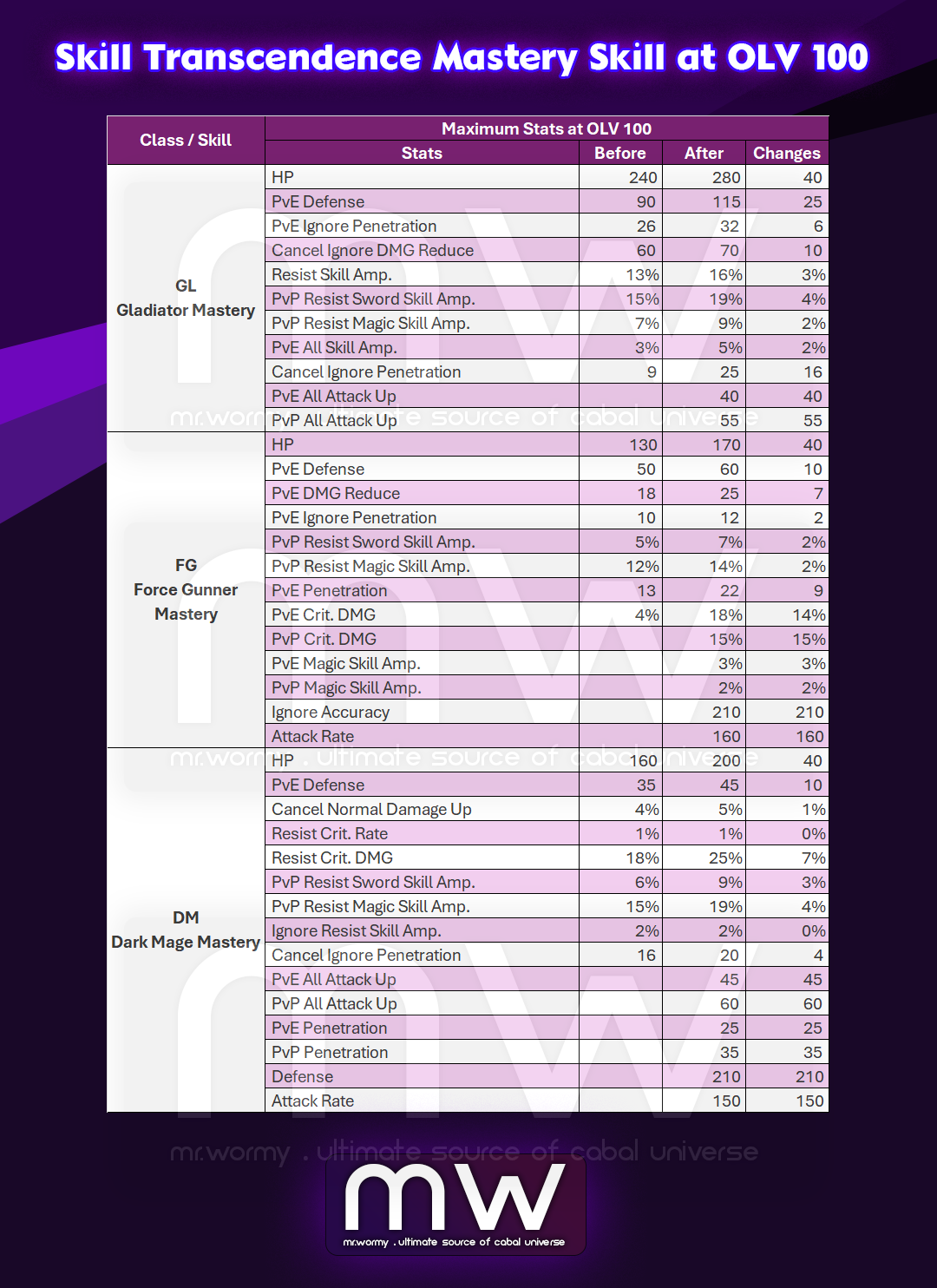 - Adjust the stats of Skill Transcendence for class Mastery skill for all classes: