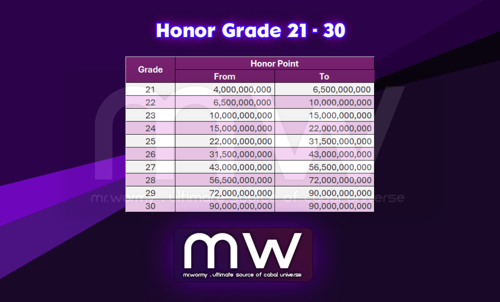 - Honor: Reward obtained by leveling up Honor Grade, up to Grade 20.