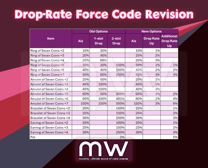 - Change of 1-slot Drop Rate and 2-slot Drop Rate for: