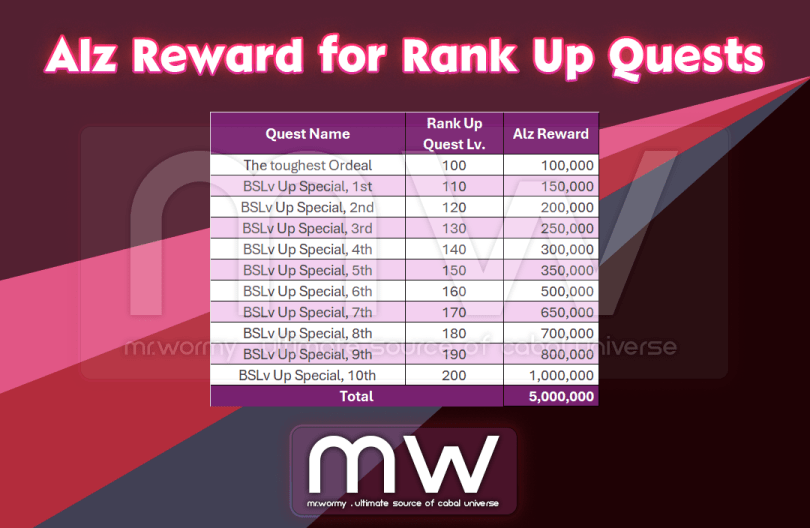 2. Added rewards for Rank Up quest from Level 100 and above, total Rewards: 5,000,000 Alz for 11 quests from Lv. 100 to Lv. 200.
