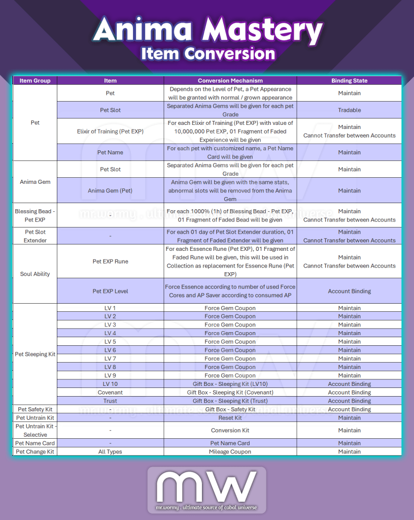 - All slots of the pet will be automatically turned into Anima Gem and mailed to highest level character in the account.