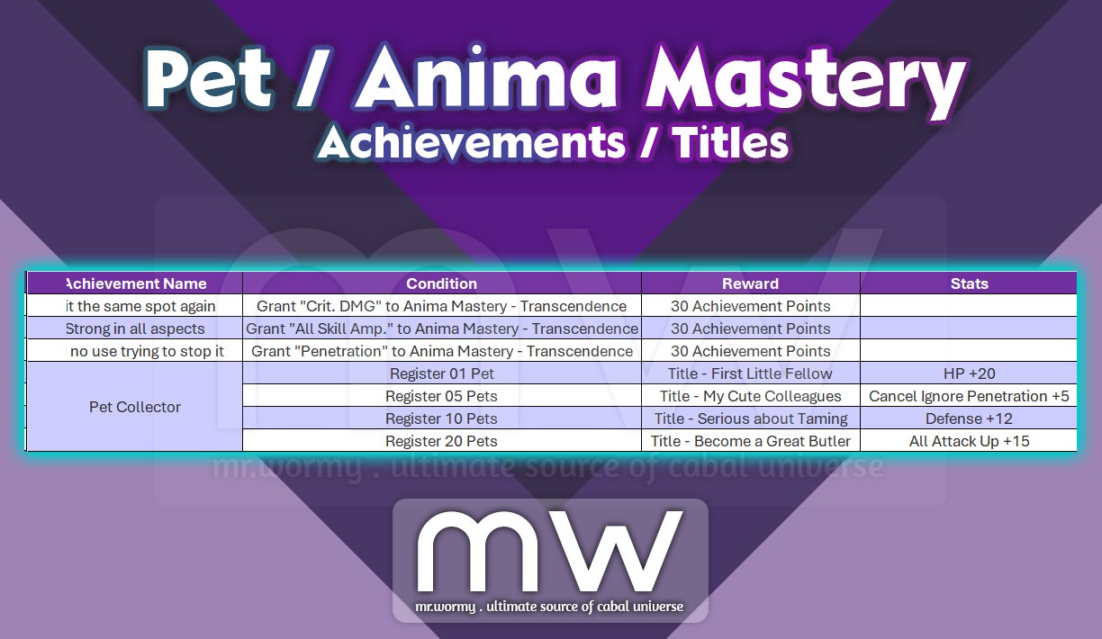 - Change the achievements of Pet before the update into achievements for Anima Mastery