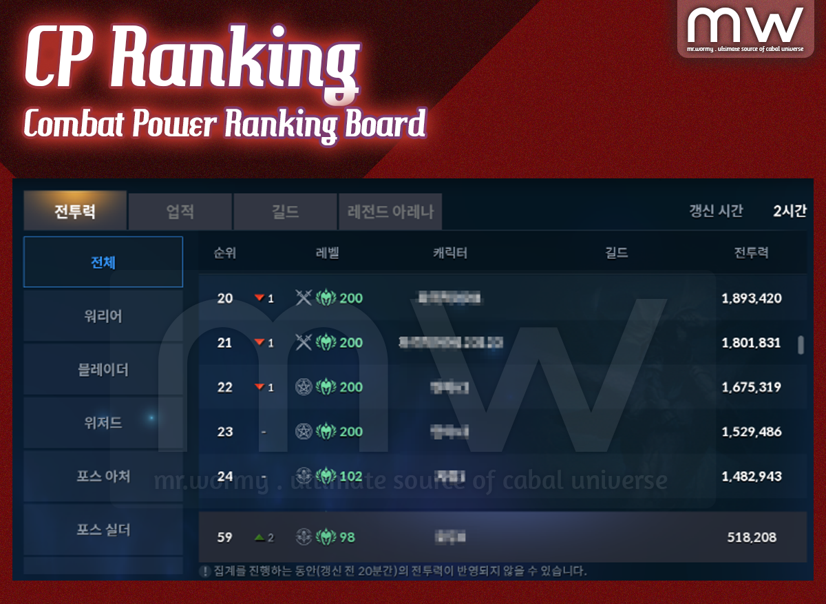 - Character with Combat Power does not update for at least one time per 7 days will be excluded from the ranking board