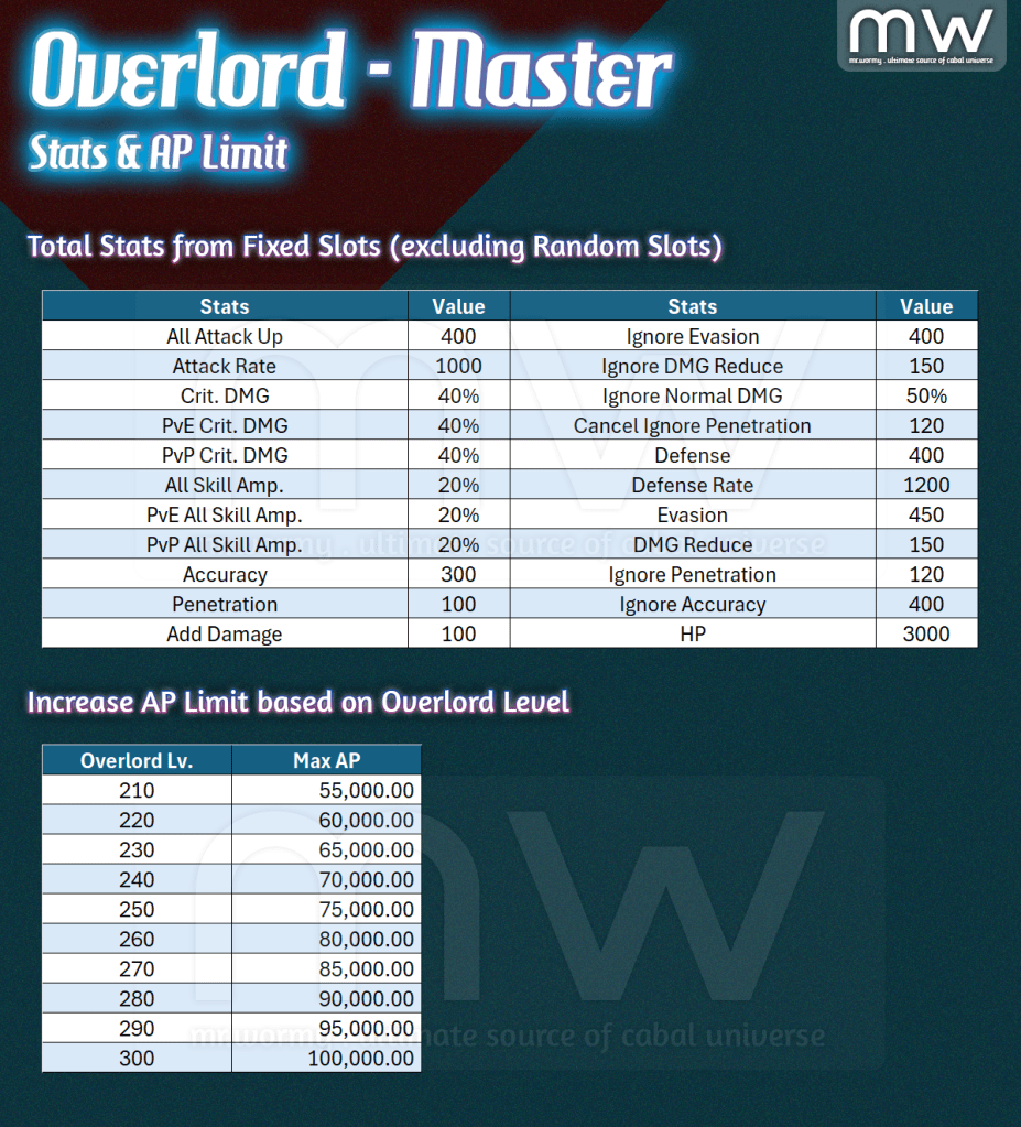 - Total Stats from Fixed Slots (stats from Random Slots are excluded) & AP Limit per Overlord Level.