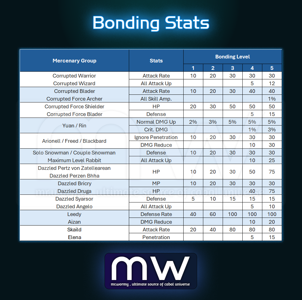 - Bonding Point is shared based on the Mercenary category, all Mercenaries in the same category share the Bonding Point.