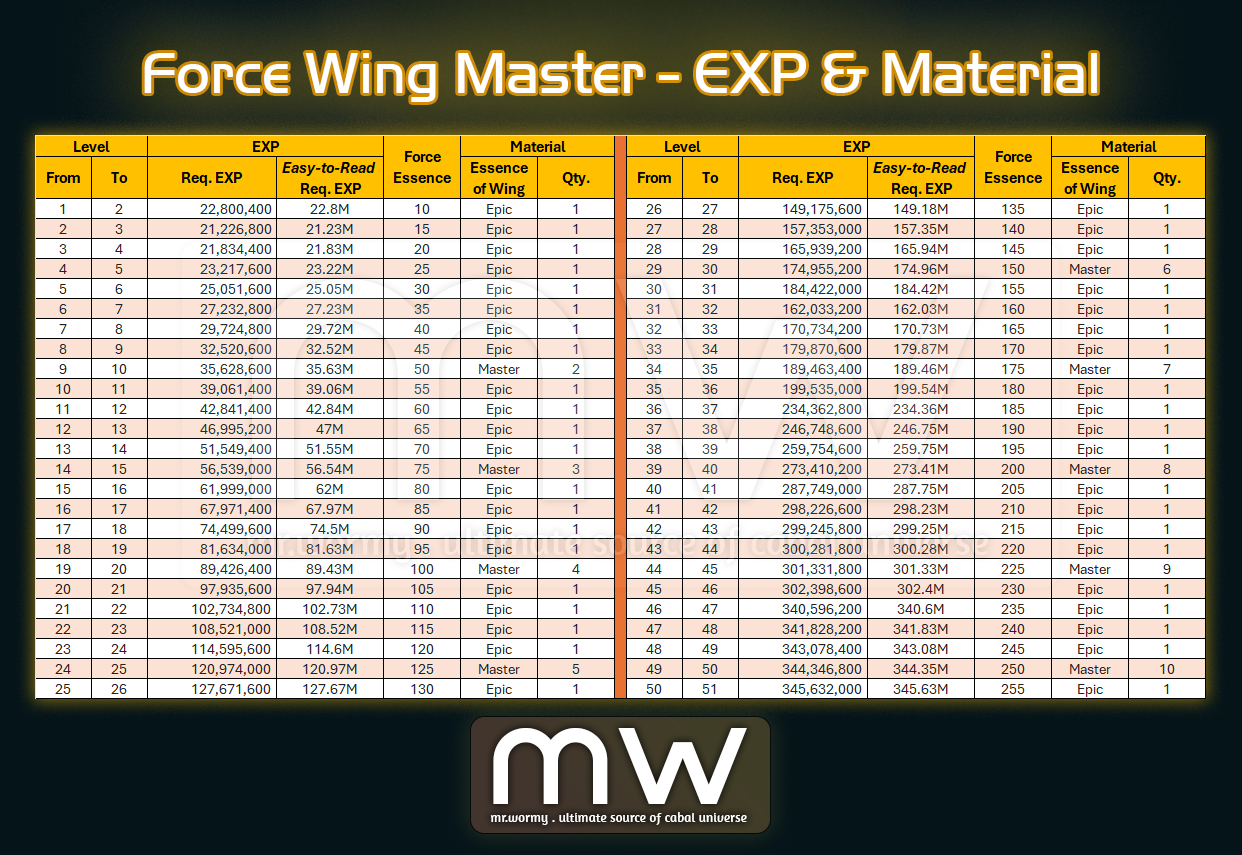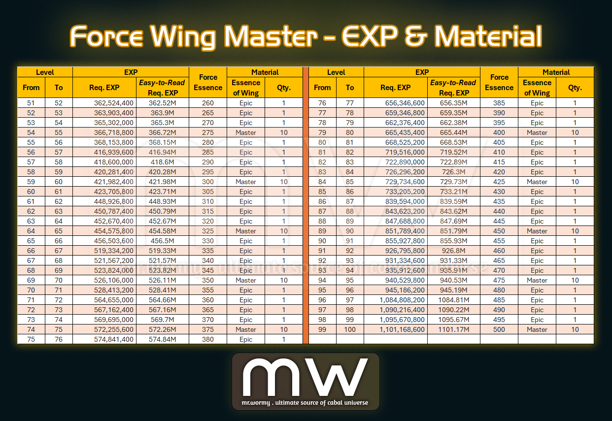 - Leveling Up Force Wing – Master rank will consume