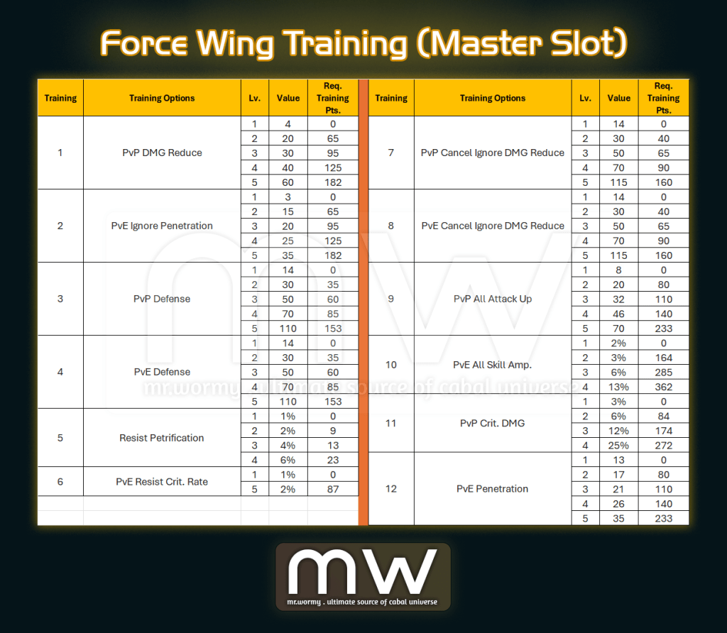 - Each slots from each training has different options and can be upgraded using Force Wing Training Point.