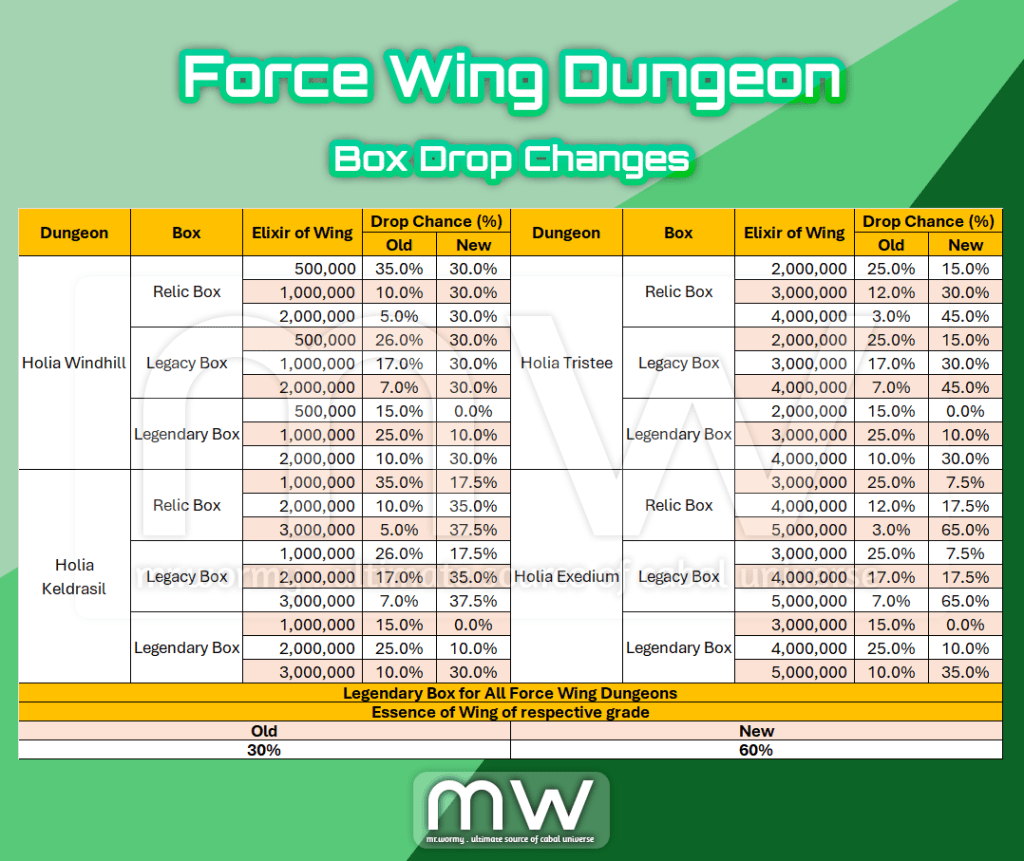 • Even the number of actual Force Wing Dungeon per week is significantly reduced, but the quality and quantity of drops (Elixir, Essence of Wing) from Force Wing Update are also updated.